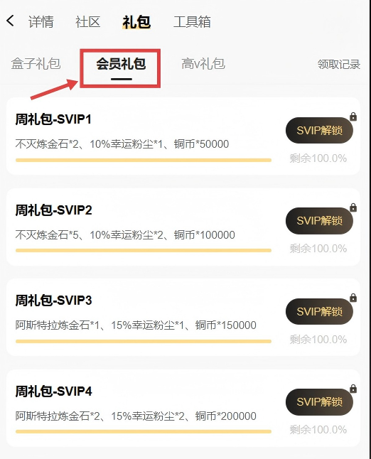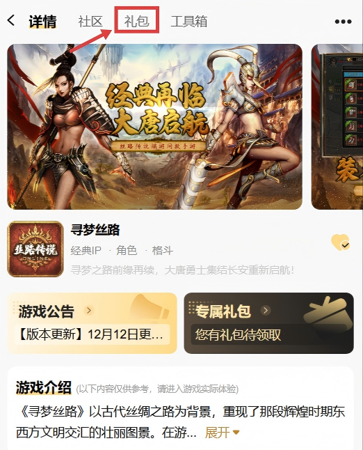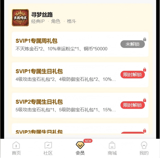 进入「39游戏盒子」-「寻梦丝路」社区找到「礼包」-「会员礼包」领取专属权益。 进入「39游戏盒子」-「会员」页面SVIP可领取的会员权益下方找到「寻梦丝路」领取专属权益。领取方式