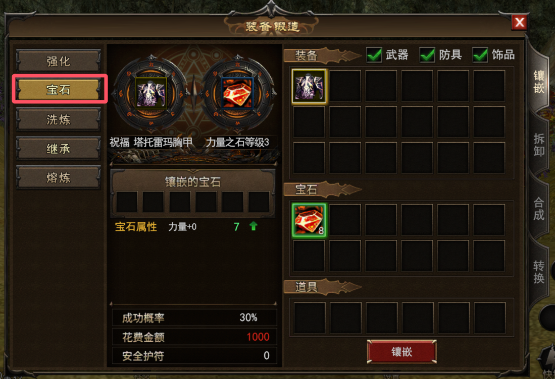 宝石分镶嵌、拆卸、合成、转换四步,每件装备最多 6 个固定宝石位。